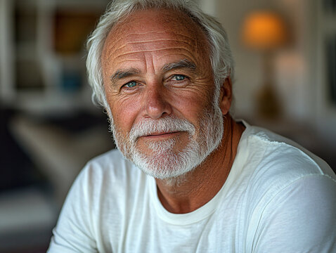 Elderly man silver hair beard wearing casual t-shirt confident expression lighting relaxed mature portrait senior gentleman thoughtful gaze aging gracefully wisdom 70 year old mockup face wise old