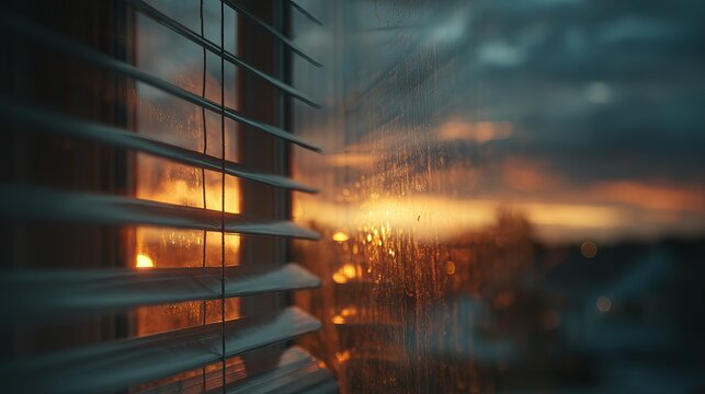 Rainy city evening viewed through a window with water droplets on the glass, capturing a quiet, introspective mood with blurred streetlights and a peaceful urban atmosphere