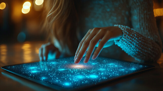 hand gently touches a tablet screen, representing the connection between human intuition and digital technology. This image symbolizes innovation, startup energy, and tech-driven creativity