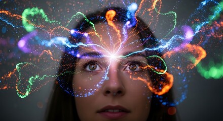 Woman with colorful energy streams emanating from her head, concept of mental power.