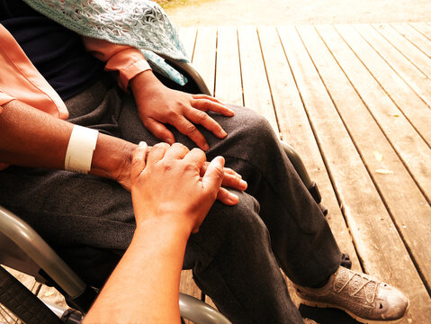 Close-up of a daughter supporting her disabled mother in a wheelchair.