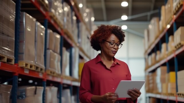 Meticulous accountant ensuring accurate record-keeping amidst the warehouse chaos. A middle-aged man stands in a warehouse with a tablet computer and checks the statements for the presence of goods