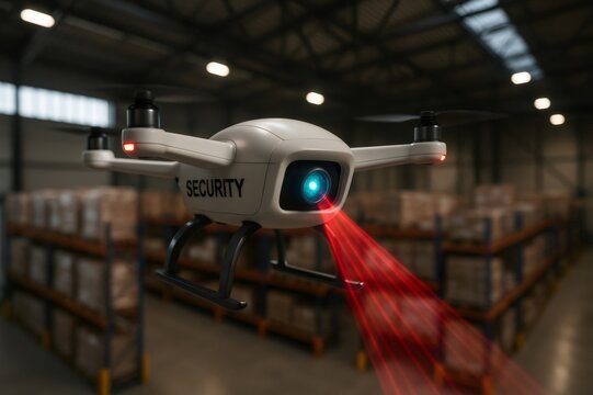 Drone with SECURITY label flying inside a warehouse, scanning inventory racks with a red laser projection