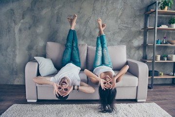 Funny couple with glasses gesturing is lying upside-down on the sofa at home. They are so cheerful, having fun together, go crazy, brother and sister