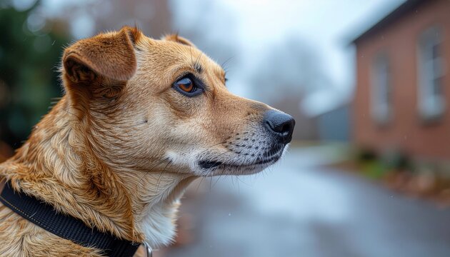 Close-Up of Dog Looking Back at Shelter. Pet Adoption Day Stories. A dog's head on a leash turning back for one final poignant look at the shelter building as the new owner pulls gently away.