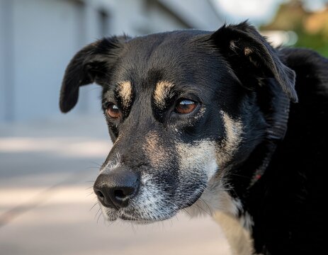 Close-Up of Dog Looking Back at Shelter. Pet Adoption Day Stories. A dog's head on a leash turning back for one final poignant look at the shelter building as the new owner pulls gently away.