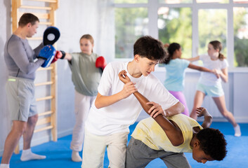 Focused teenager learning effective self defence techniques in sparring with boy under guidance of experienced instructor in gym, practicing painful armlock