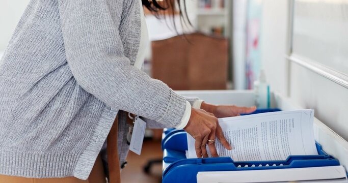 Teacher, hands and paperwork for exam, classroom and planning on table, education and person in academy. Literature, sorting and professor with documents, evaluation and invigilator in high school
