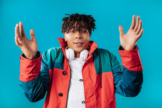 Isolated shot of surprised young Afro American woman pretends catching something big, keeps palms, holds invisible object from under, dressed in casual sweatshirt, isolated on beige background.