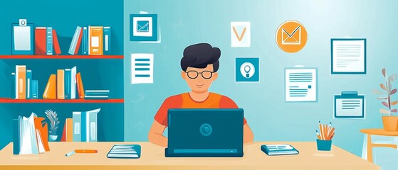 An inviting home study area with a student focused on virtual classes, surrounded by modern technology like laptops and educational apps, highlighting the transition to digital learning in