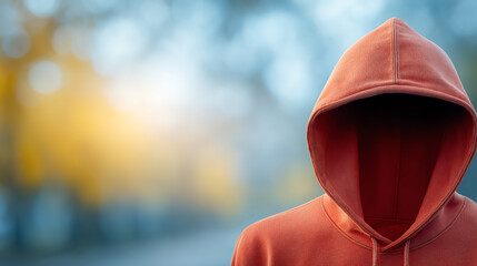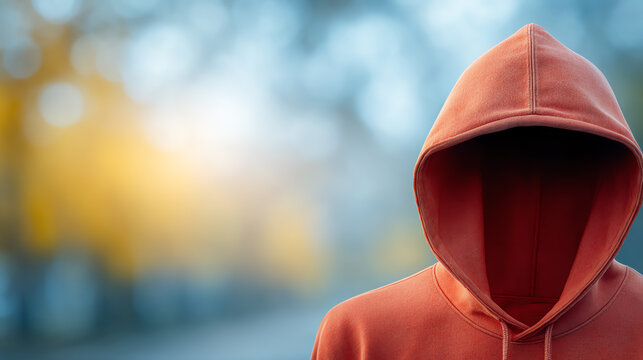A mysterious figure in a red hoodie stands against a blurred natural background, invoking curiosity and intrigue in an urban setting.