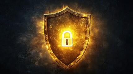 A fiery golden shield, a symbol of strong protection, glows intensely, its center featuring a bright padlock, emphasizing the concept of impenetrable security.