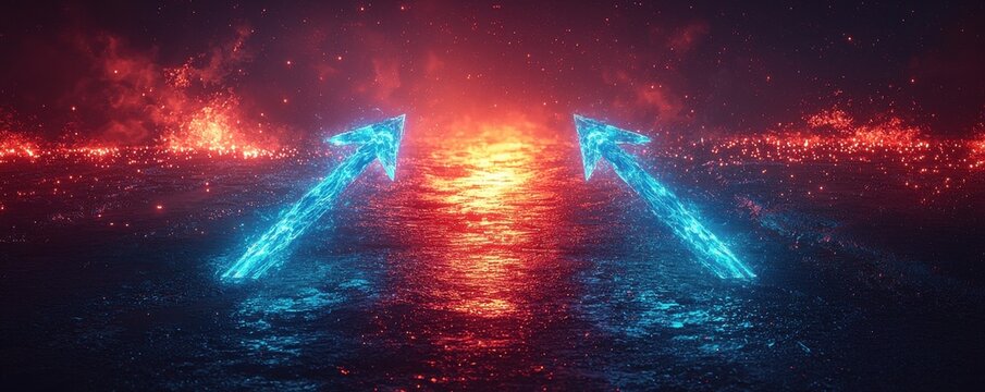 Glowing red neon arrows pointing inwards over a dark, reflective surface