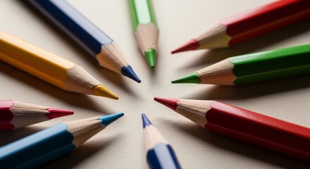 Brightly colored pencils arranged in a circle with sharpened tips pointing inwards