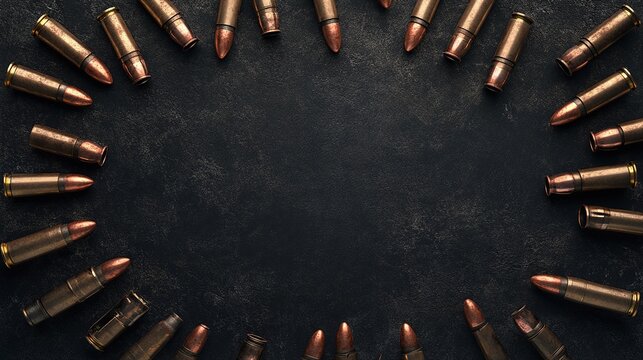 Spent bullet casings arranged across a black-to-grey gradient background, with guns pointing inward from each corner