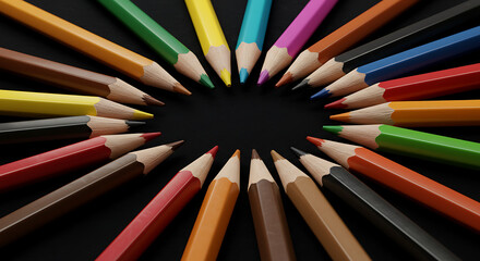 A macro close-up of many colorful, sharpened pencils arranged in a perfect radial circle with tips pointed inward towards a black center, creating an intense, vibrant focus. Abstract studio photo.