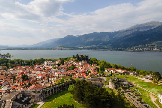 Aerial view of Ioannina old town, a small town along Lake Ioannina, Epirus, Greece.
