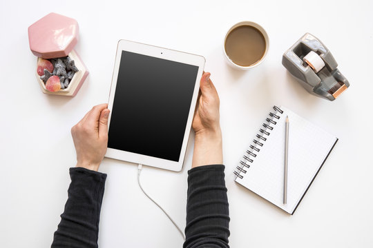 Office desk table with tablet,coffee cup ,pencil ,flower ,notepad on white desk. Top view with copy space.