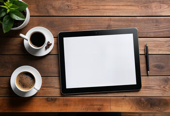 Flatlay digital tablet blank screen on work desk with glasses and coffee