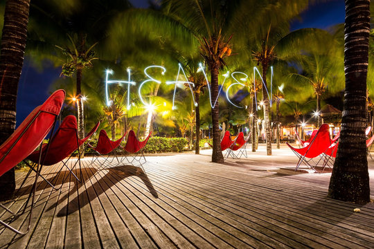 Heaven word - Pictured by light letters on Mauritius island at night with a stunning background.