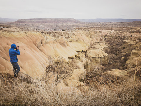 Male tourist in blue jacket professionaly take a photo of the white valley in Cappadocia. Photography destinaion - Turkey . Intentional old vintage look.