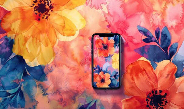 Artistic smartphone mockup against a vibrant watercolor floral seamless background