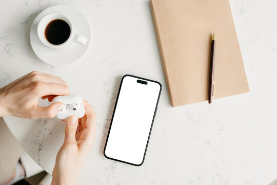 A mobile phone with a white screen on a woman's desktop