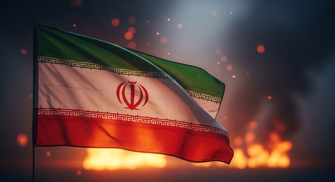 The Iranian flag waving with its distinctive green, white, and red colors and emblem.