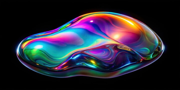 Abstract iridescent liquid blob on a black background. Perfect for use in modern art projects, futuristic website designs, or presentations on fluid dynamics and abstract concepts.