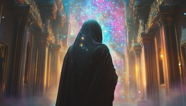 Figure in cloak stands before glowing cosmic doorway indoors