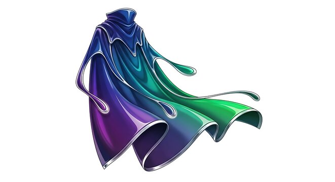 Isolated flowing iridescent cloak with hood in shades of purple blue and green on white background