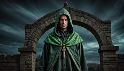 Runic mayor wearing an elegant dark robe with iridescent green runes, mystical atmosphere