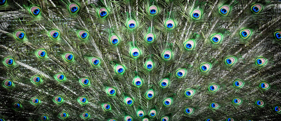 Peacocks pattern or texture. Colorful and Artistic peacock feathers banner or panorama..
