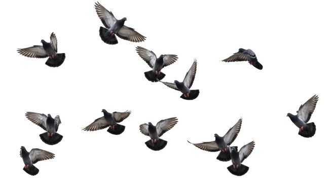 Scattered flock of adult dark gray iridescent Common Pigeons in mid-flight, wings in motion, detailed feather structure, against a transparent studio background with bright high-key lighting, abundant