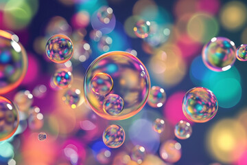 Close-up of colorful iridescent soap bubbles floating in air with soft background for dreamy abstract photo