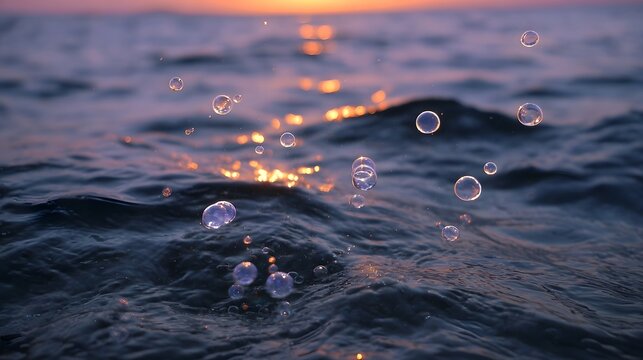 Close up of iridescent bubbles rising from dark rippling water at twilight with soft sunset reflections