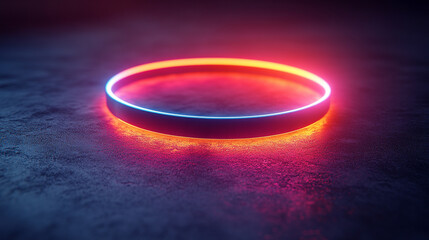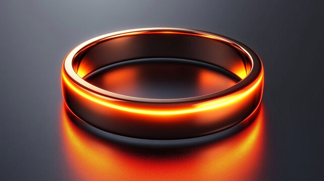 A glowing, iridescent ring rests on a dark, reflective surface, symbolizing modern elegance, mystery, and futuristic beauty in a minimalist setting.