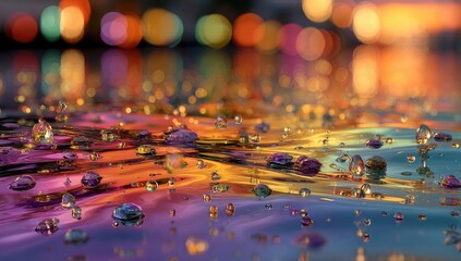 Iridescent water surface glimmering with micro-waves, rainbow reflections and bokeh