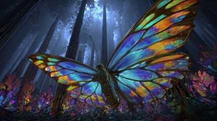 Large iridescent butterfly in dark forest