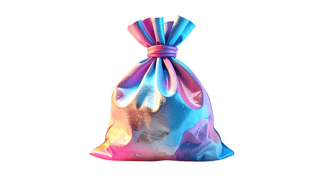A small, shiny gift box is wrapped in iridescent paper with a matching bow, placed on a glittery background