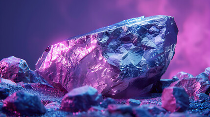 Studio macro very close-up shot, product photography, Iridium precious metal rock. Isolated against purple background. Bright, studio lighting. Very modern, contemporary, current style