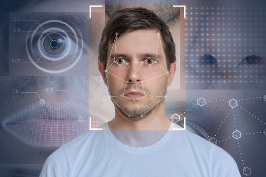 Face detection and recognition of man. Computer vision and machine learning concept.