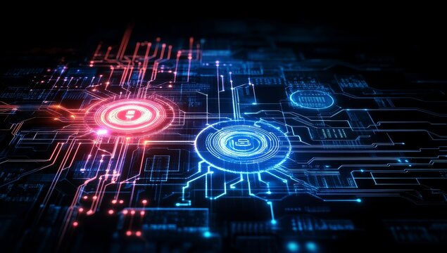 Cybernetic blue eye monitoring digital network with neon hud rings and metallic frame