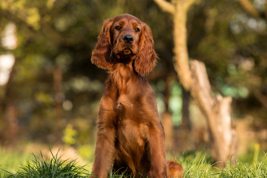 Dog portrait, irish red and white setter on golden sunset background, outdoors, horizontal