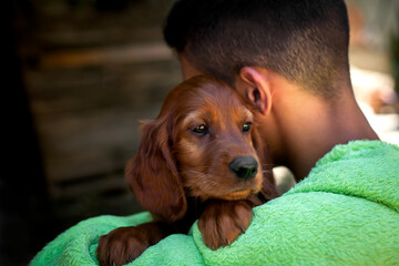Young irish red setter dog at nature on green grass. Outdoor portrait of pet.