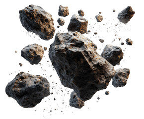 A collection of dark, rough asteroids and space debris floating in space, isolated on transparent background