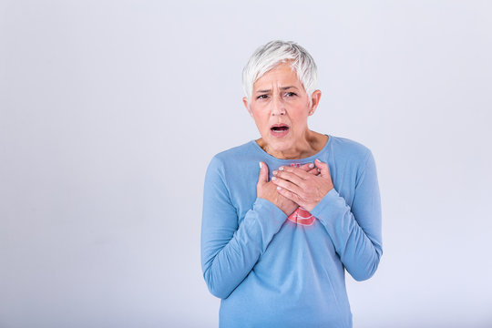 Woman having a pain in the heart area. Heart Attack. Painful Chest. Health Care, Medical Concept. High Resolution. Woman having heart attack at home