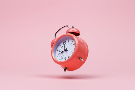 The pink alarm clock is levitate in the air, against a pink background. The concept of time, copy space.