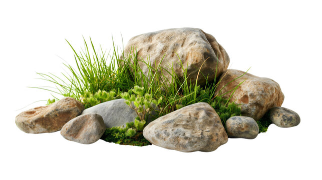 Closeup of nature lichen stone rocks with green grass cut out isolated transparent background