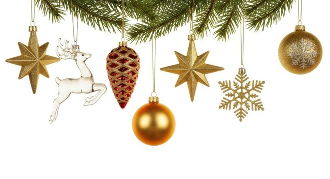 Various christmas ornaments hanging from a pine branch isolated on white background